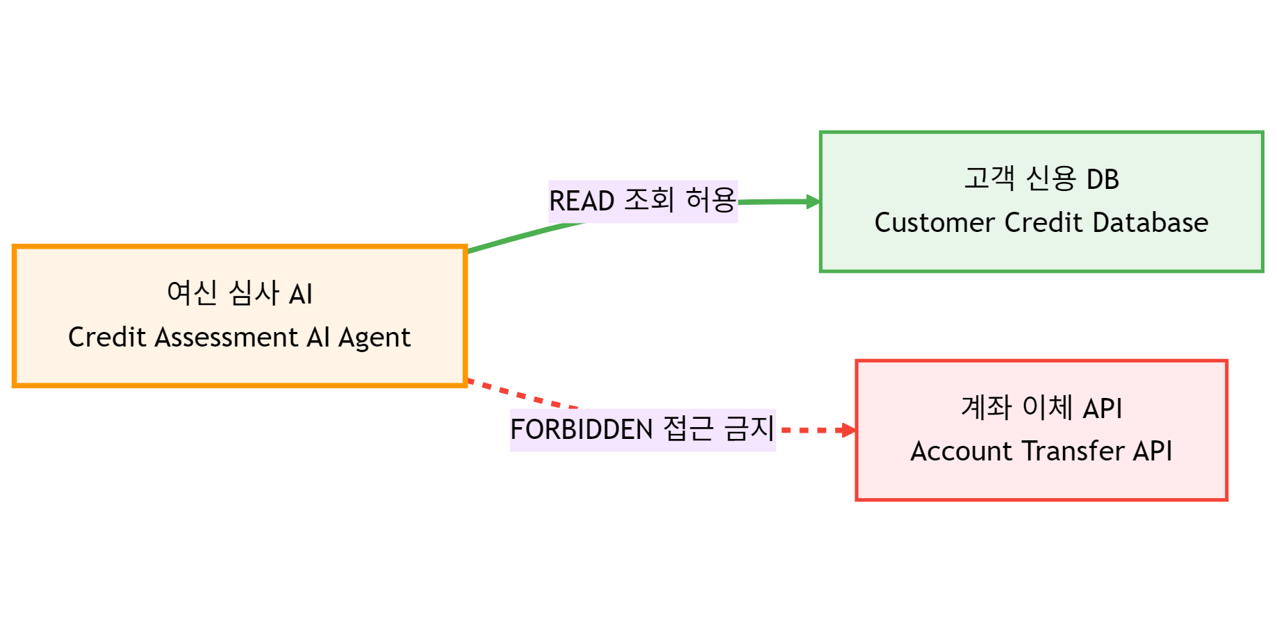 - '여신 심사 Agent'(agent-loan-reviewer)가 고객 신용 점수를 조회할 때, 시스템은 "아, '여신 심사팀' 소속의 AI가 정상적인 업무로 조회하는구나"라고 알아야 합니다.