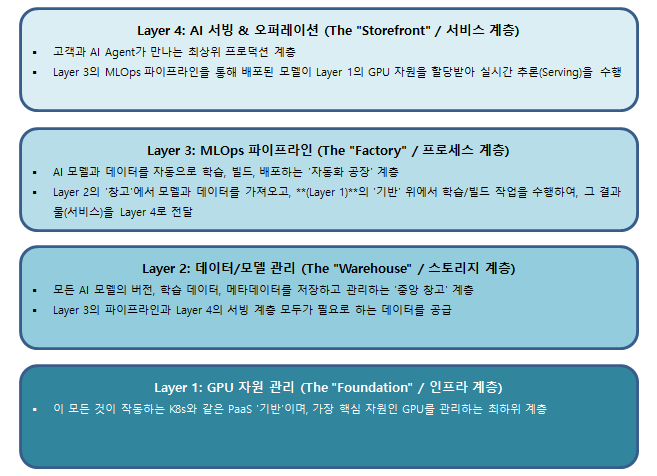 - 모델 배포: "코드가 아닌, 수 GB에 달하는 'AI 모델'과 '데이터'를 어떻게 버전 관리하고 무중단 배포할 것인가?"